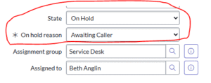 Change the state to on hold and awaiting caller as the on-hold reason.